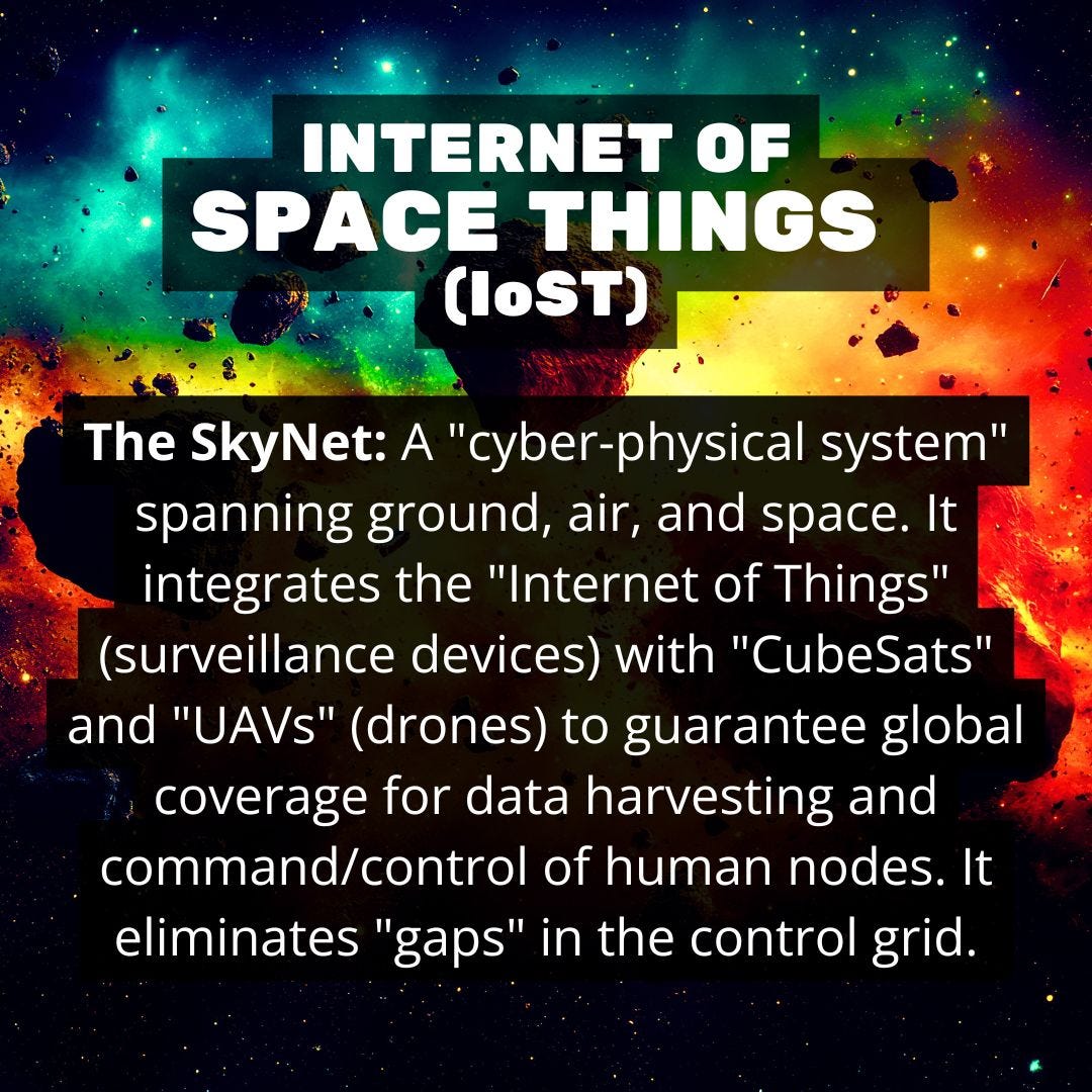 The Truth: This is about No Escape. The IoST ensures that the Global Information Grid (GIG) covers every square inch of the planet. Whether you are in a Smart City or the middle of the Sahara, the CubeSats and UAVs ensure you remain a trackable node. The system is designed for “monitoring and reconnaissance,” essentially a planetary wiretap.