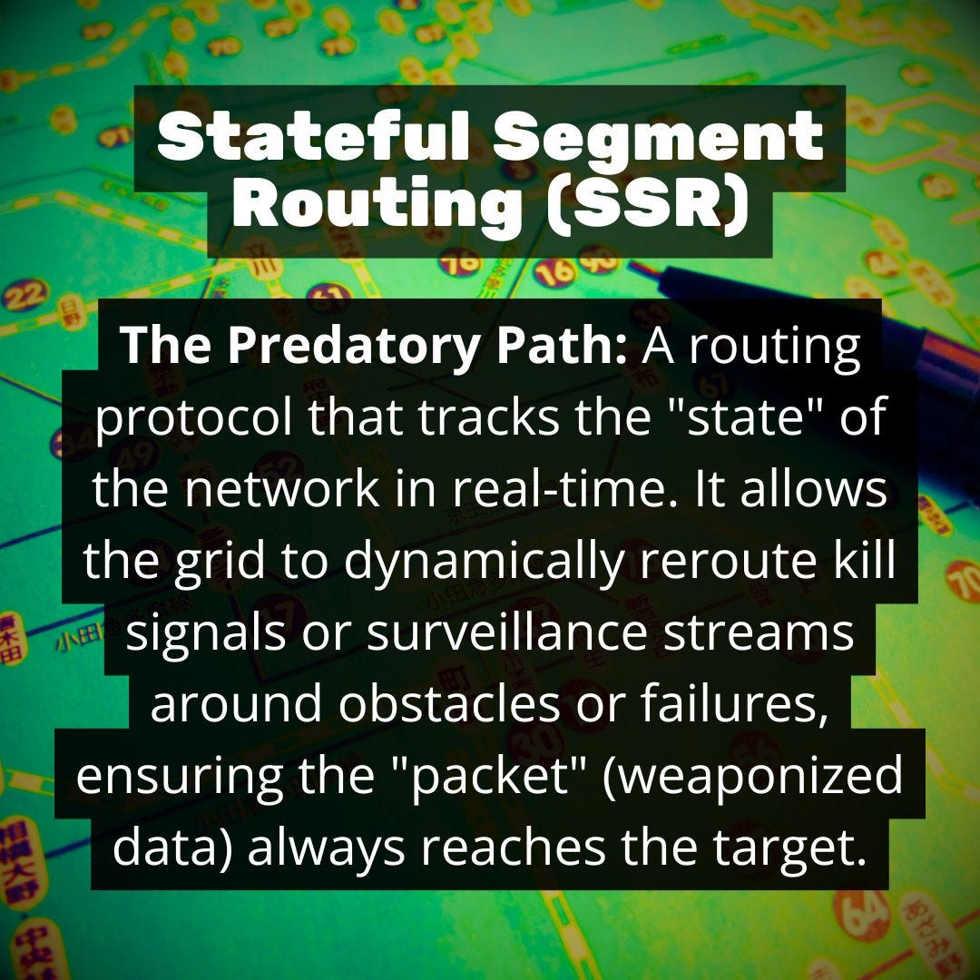 The Truth: This creates CubeSats-as-a-Service. The control of the satellite grid is centralized and software-based. The “intelligence” is not in the satellite but in the Central Bank Authority’s algorithms. The network uses “Stateful Segment Routing” (SSR) to overcome latency, meaning the network “knows” the state of the target and the path at all times. It removes human operators from the loop, allowing the AI to manage the orbital assets autonomously.