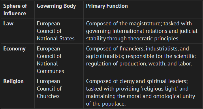 Saint-Yves’ model sought to neutralize the “chaos” of the street by dividing society into three specialized spheres of influence. This tripartite structure was designed to ensure that those who are in power (the administrators) remain subordinate to those who possess true Authority (the initiates and experts).