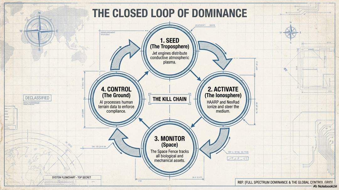 The creation of an ionized sky involves the systematic saturation of the atmosphere with conductive metal nanoparticles, polymers, and other chemical aerosols. Jets disperse these reflective and conductive materials, such as aluminum oxide, barium, and strontium, into the troposphere and stratosphere. Once dispersed, these particulates are heated and activated by ground-based radio frequency (RF) transmitters and ionospheric heaters like HAARP (High-frequency Active Auroral Research Project). This combination of chemical “dumping” and electromagnetic “pumping” transforms the natural atmosphere into a highly charged, plasma-like state, effectively turning the lower atmosphere into a conductive antenna.