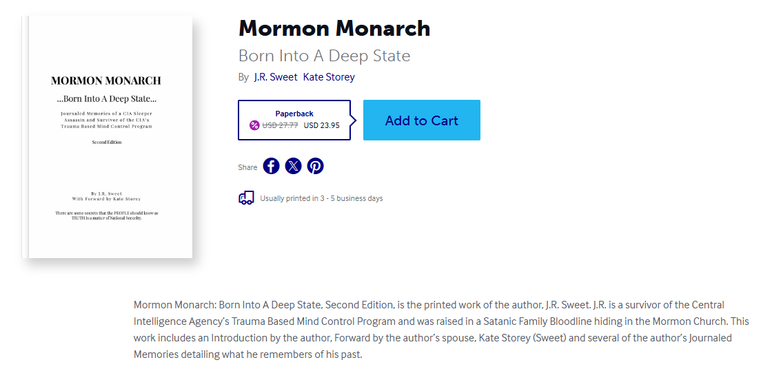 Mormon Monarch: Born Into A Deep State, Second Edition, is the printed work of the author, J.R. Sweet. J.R. is a survivor of the Central Intelligence Agency’s Trauma Based Mind Control Program and was raised in a Satanic Family Bloodline hiding in the Mormon Church. This work includes an Introduction by the author, Forward by the author’s spouse, Kate Storey (Sweet) and several of the author’s Journaled Memories detailing what he remembers of his past.