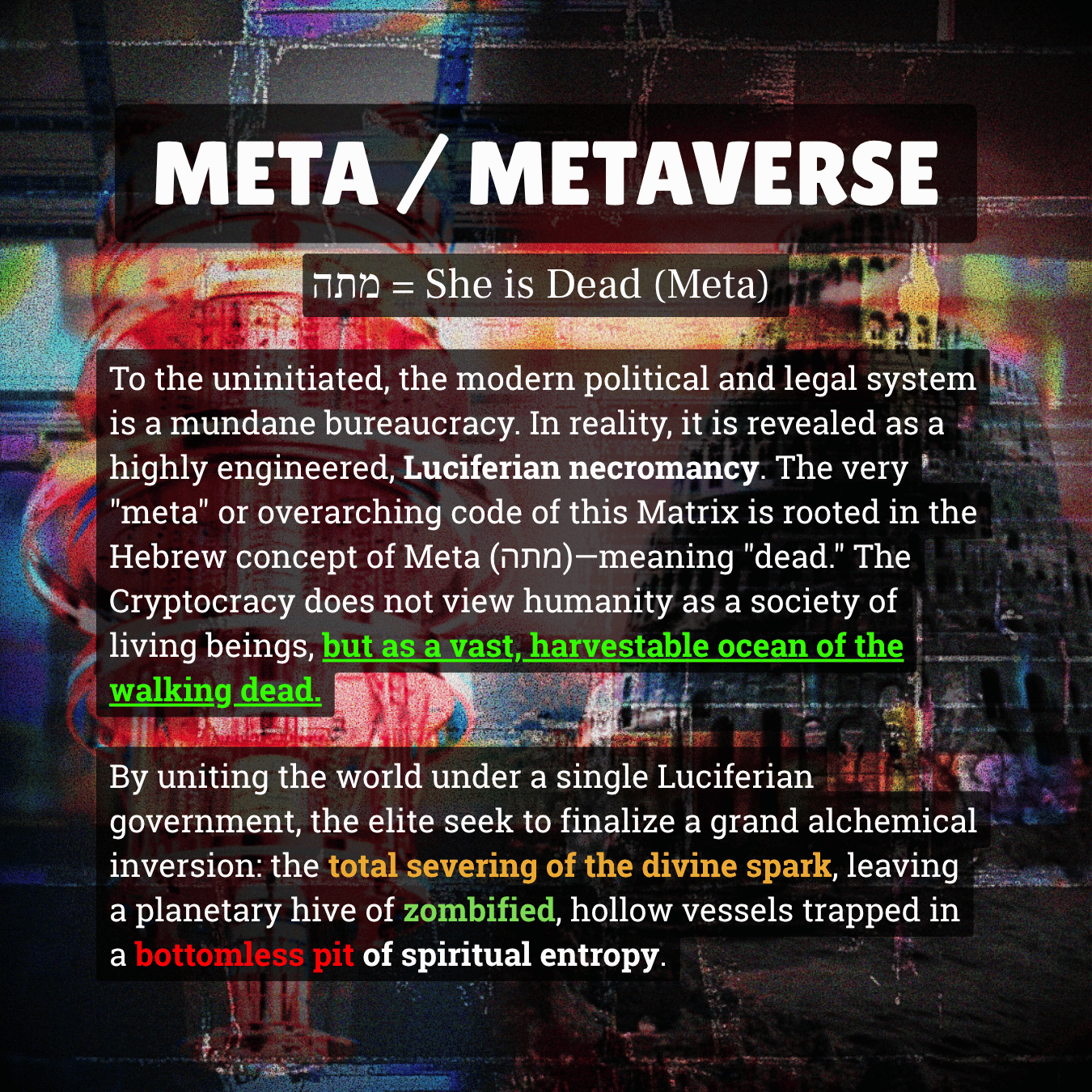 In Lexicon Entry #004, we discuss the “Metaverse” and reveal a framework of Luciferian necromancy and hauntology. From the Hebrew etymology of the word “Meta” meaning “dead” to the legal fiction of the maritime straw man, this presentation explores how humanity is being systematically pushed into a digital terrarium.