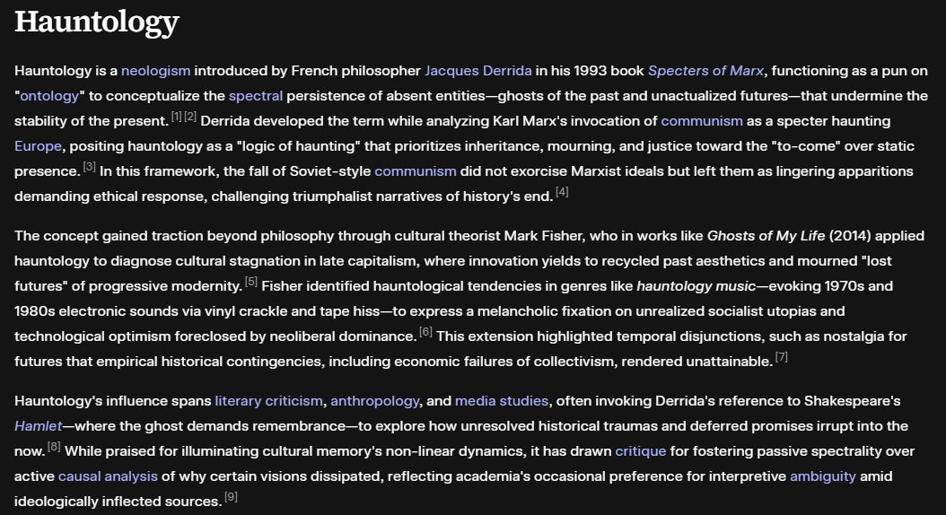 See my extended notes on these two concepts: https://docs.urbanodyssey.xyz/mahanism/hauntology.html