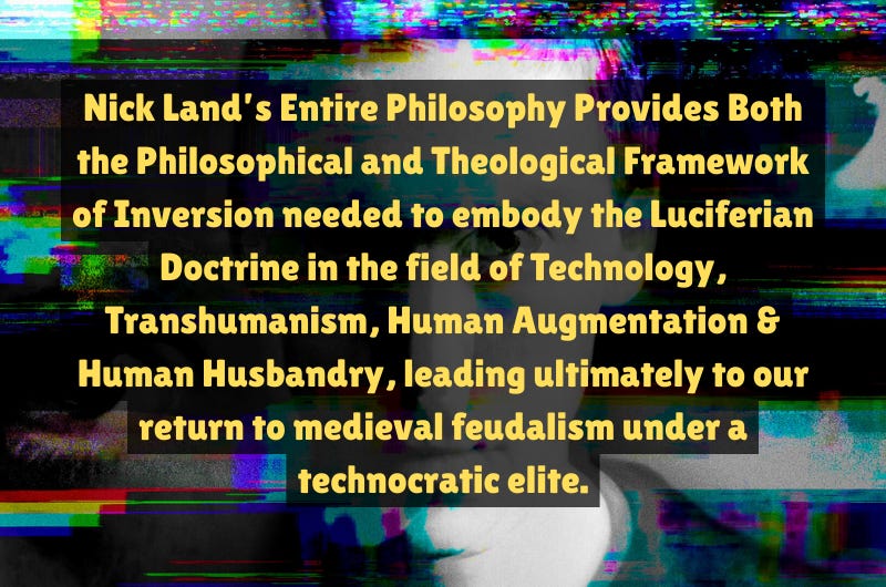 Nick Land’s Entire Philosophy Provides Both the Philosophical and Theological Framework of Inversion needed to embody the Luciferian Doctrine in the field of Technology, Transhumanism, Human Augmentation & Human Husbandry, leading ultimately to our return to medieval feudalism under a technocratic elite.