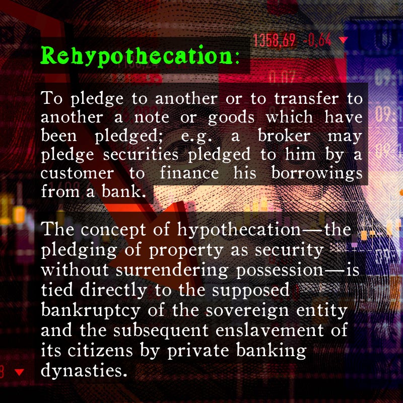 The concept of hypothecation—the pledging of property as security without surrendering possession—is tied directly to the supposed bankruptcy of the sovereign entity and the subsequent enslavement of its citizens by private banking dynasties.