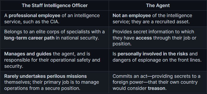 In the lexicon of intelligence, the terms “officer” and “agent” are not interchangeable. They represent two entirely different roles. The staff intelligence officer is a career professional employed by a national intelligence service. The agent is a foreign national who has been recruited by that officer to provide secret information. One is the manager of the operation; the other is the person taking the direct risk.
