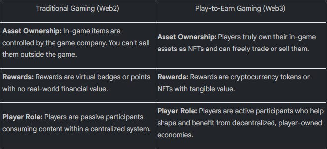 The key difference between traditional (Web2) gaming and Web3 P2E gaming is the shift from a closed ecosystem, where the company owns everything, to an open one where players can earn real financial rewards and truly own their digital assets. Traditional games operate in closed systems, while P2E games are built on open, decentralized platforms where players have true ownership.
